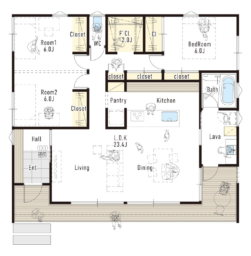 広々としたワンフロアで家族全員がつがり、無駄のない動線で快適に過ごせる平屋プランです。